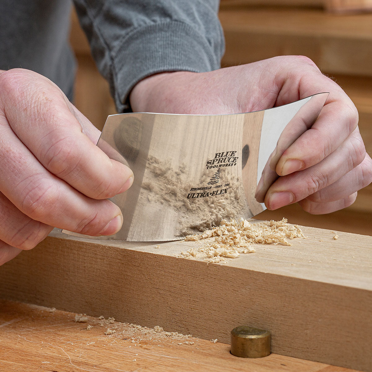 At the far end of the spectrum lies our .015" Ultra-Flex. Here's a scraper you can bend to your will…literally. With your thumbs in the center of the blade, you can increase or decrease the aggressiveness of the cut or fit the blade into gentle contours with just a gentle squeeze.